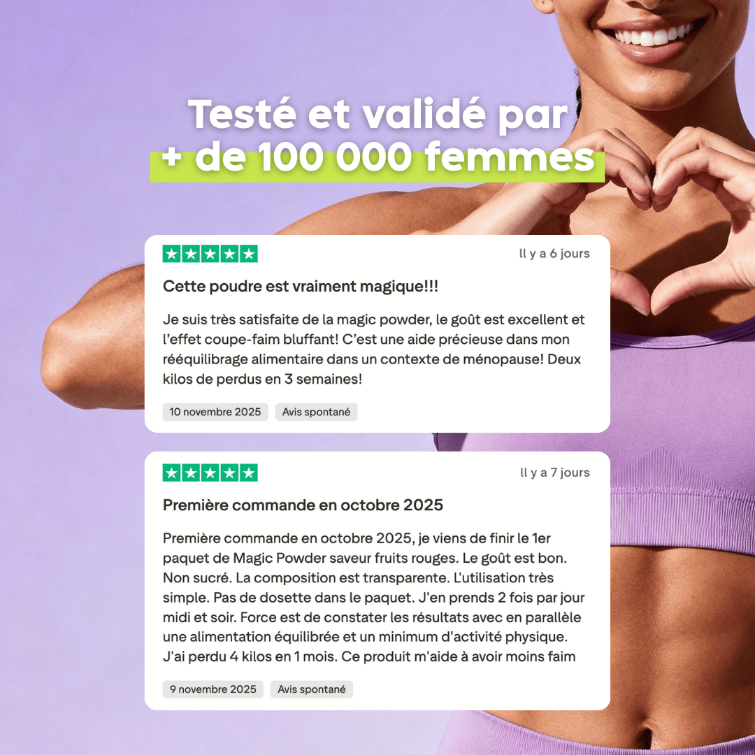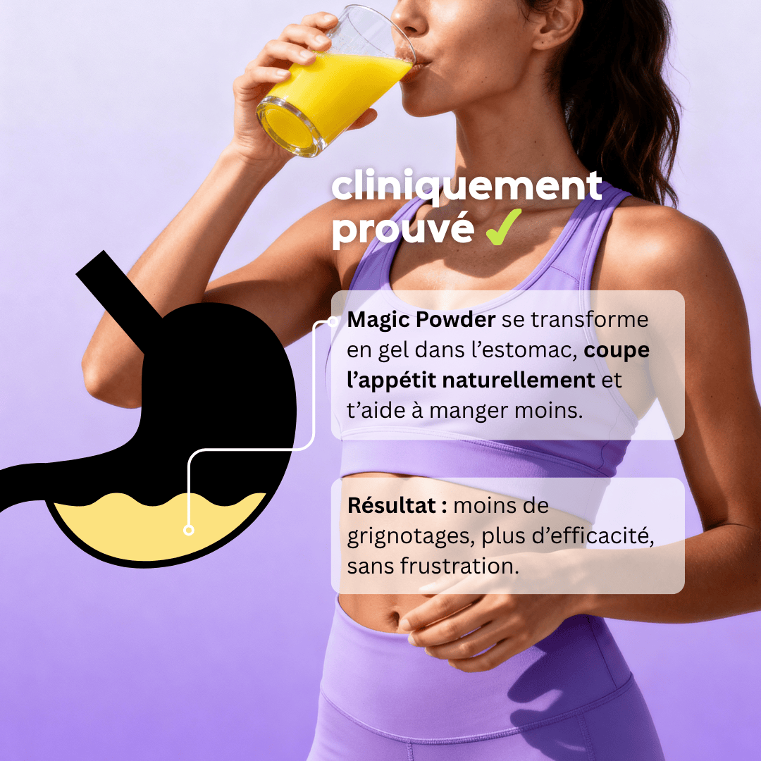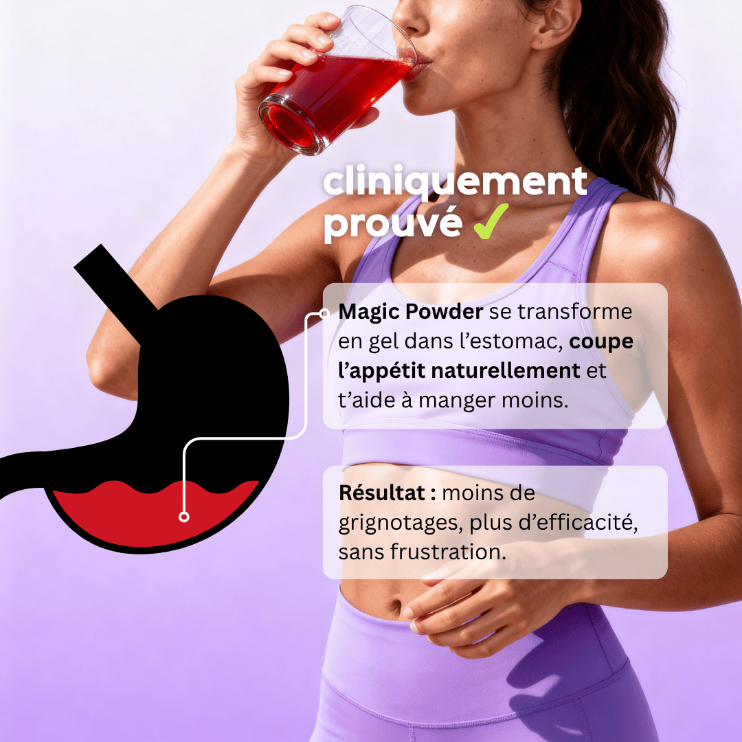 Vous en avez assez de céder aux fringales et de saboter vos efforts minceur ? Grâce à l’effet coupe-faim naturel du MAGIC POWDER, vous prenez enfin le contrôle sur vos portions et vos grignotages. Fini la frustration : faites rimer plaisir et équilibre pour atteindre vos objectifs plus vite que vous ne l’imaginiez. Prenez les rênes de votre appétit et savourez le changement !